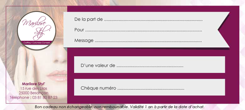 Le salon de coiffure Marilore Styl’, situé à Besançon (25 Doubs, Franche-Comté), met à votre disposition des chèques cadeaux pour que vous puissiez faire plaisir à vos proches.